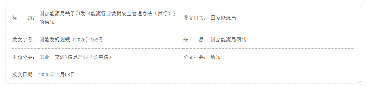 国家能源局关于印发《能源行业数据安全管理办法(试行)》的通知